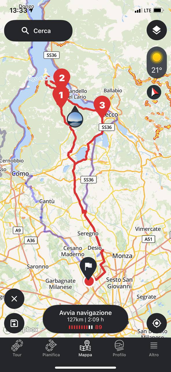 Calimoto, con partenza da Paderno, dice 127 km.